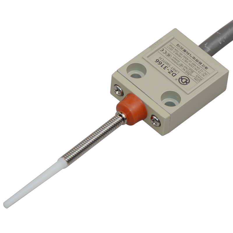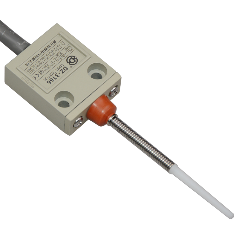 • DZ-3166防水行程開(kāi)關(guān),樹(shù)脂棒盤(pán)簧型,萬(wàn)向式,通用直立型,小型、薄形、IP68防護(hù)等級(jí),樹(shù)脂與耐油軟線融合牢固,高度密封性兼具的緊湊型限位開(kāi)關(guān)。適用于積水、潮濕環(huán)境下的機(jī)械設(shè)備,作位移電路通斷信號(hào)檢測(cè)控制。