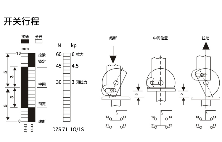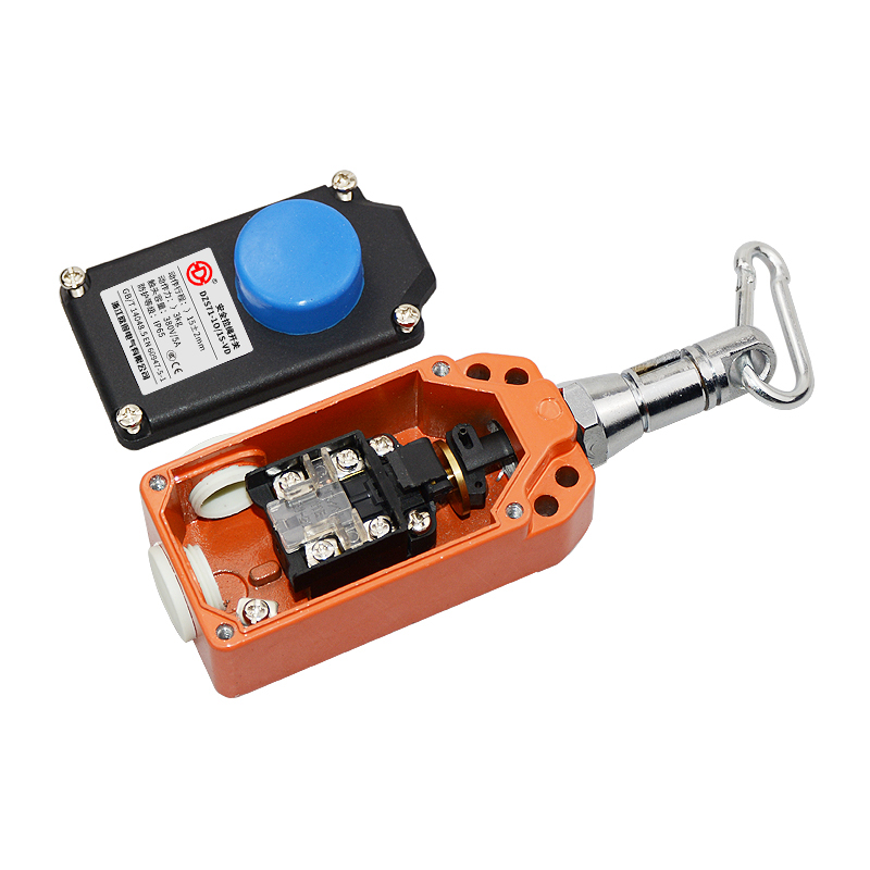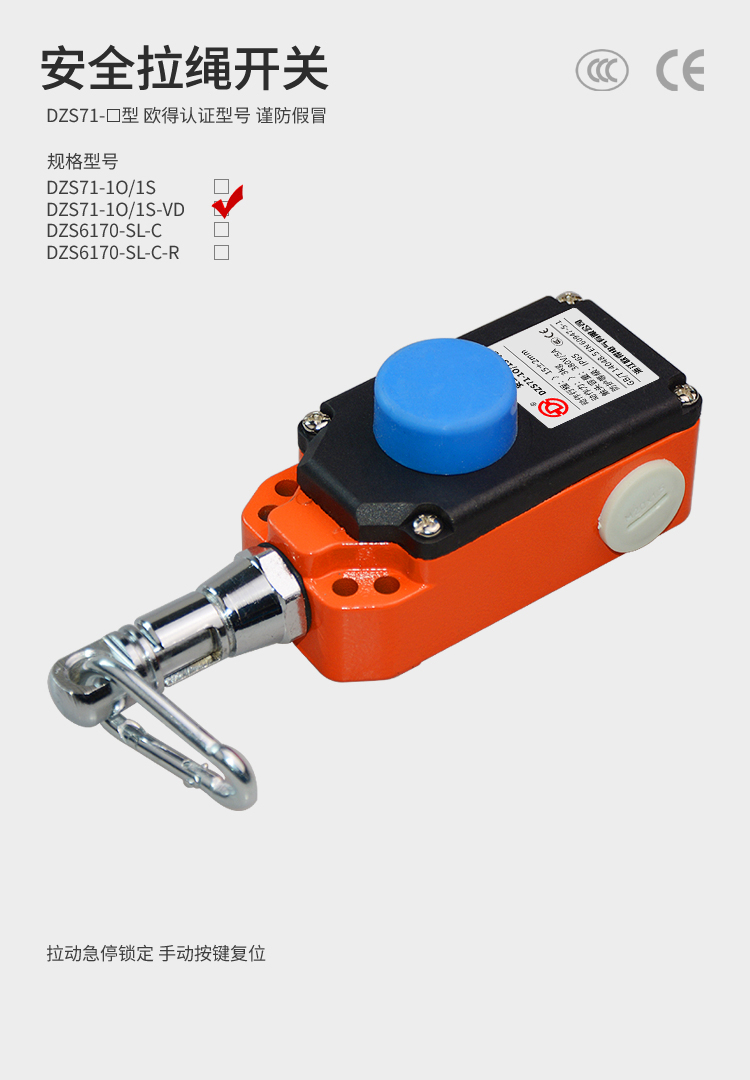 • DZS71-1O/1S-VD安全拉繩開(kāi)關(guān),拉動(dòng)式、急停鎖定、藍(lán)色復(fù)位鍵,2回路(1常開(kāi)1常閉),金屬殼體、塑膠蓋板。適用于流水線、輸送帶、高空作業(yè)車(chē)等機(jī)械設(shè)備位移信號(hào)控制,保護(hù)操作員不受機(jī)器傷害。額定絕緣電壓400伏,發(fā)熱電流10安培,工作電壓交流380伏、電流0.8安培,直流220伏、電流0.15安培,防護(hù)等級(jí)IP65,戶外使用請(qǐng)注意防水措施。