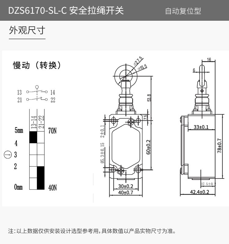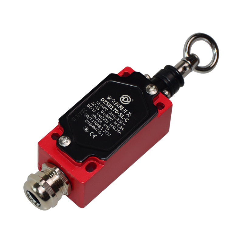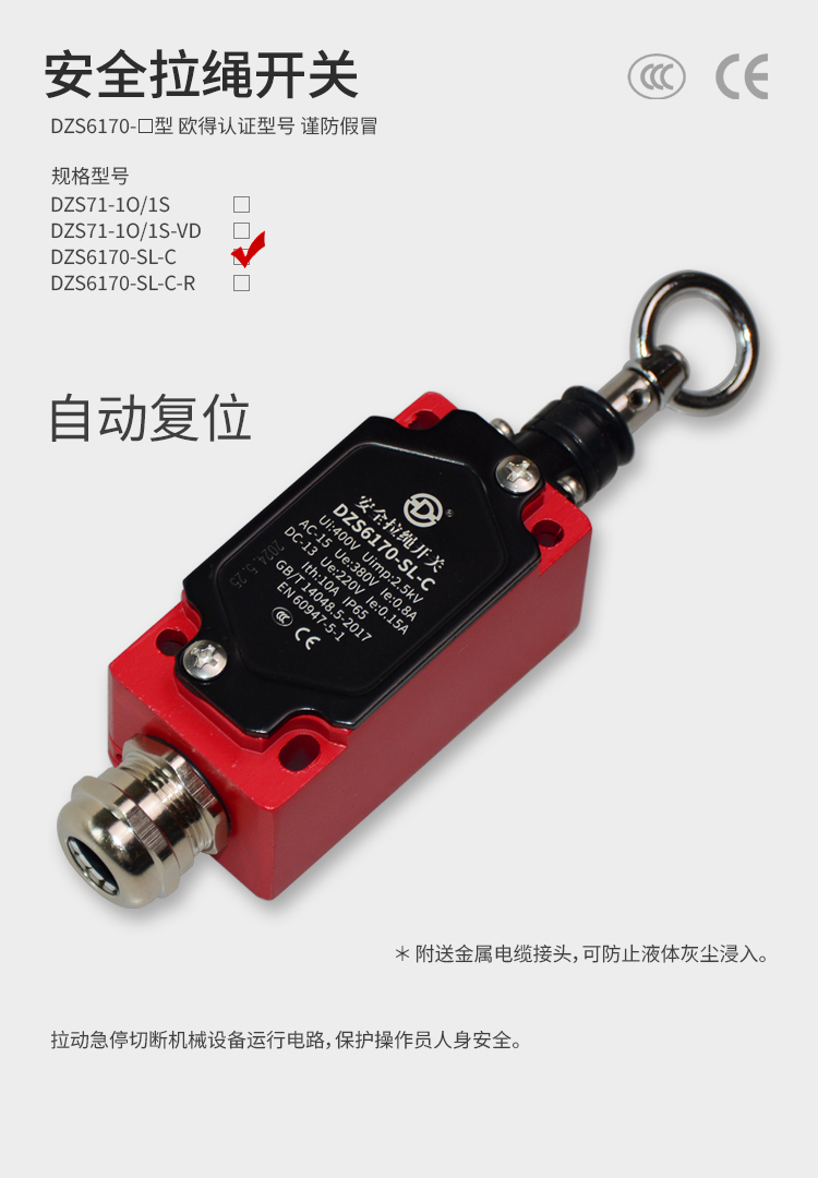 • DZS6170-SL-C安全拉繩開關(guān),拉動式、自動復(fù)位型。默認接點為2回路(1常開1常閉)、可定制非標2常閉(2NC)。金屬殼體,堅固耐用。適用于流水線、輸送帶、高空作業(yè)車等機械設(shè)備位移信號控制,保護操作員不受機器傷害。額定絕緣電壓400伏,發(fā)熱電流10安培,工作電壓交流380伏、電流0.8安培,直流220伏、電流0.15安培,防護等級IP65,戶外使用請注意防水措施。