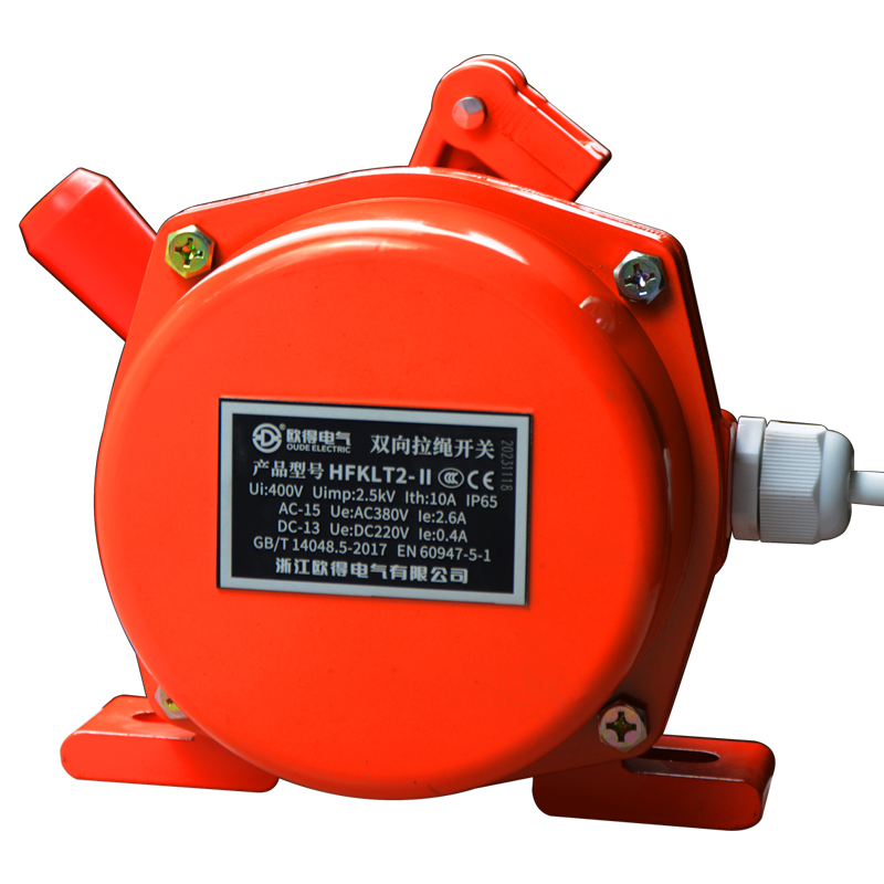 HFKLT2-Ⅱ雙向拉繩開關(guān),是用于膠帶運輸機現(xiàn)場,緊急事故停機的一種保護裝置。當(dāng)緊急事故發(fā)生時,在現(xiàn)場任意處啟動拉繩開關(guān),均可發(fā)出停機信號。絕緣電壓400伏,發(fā)熱電流10安培,工作電壓電流交流380伏、2.6安培,直流220伏、0.4安培,防護等級IP65。